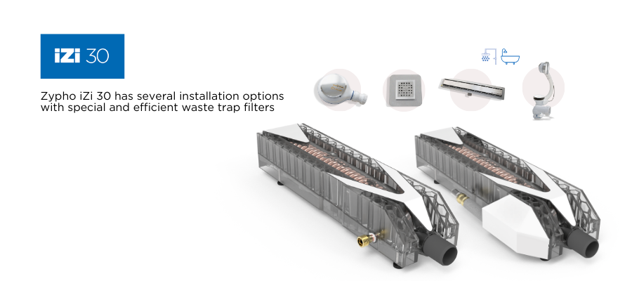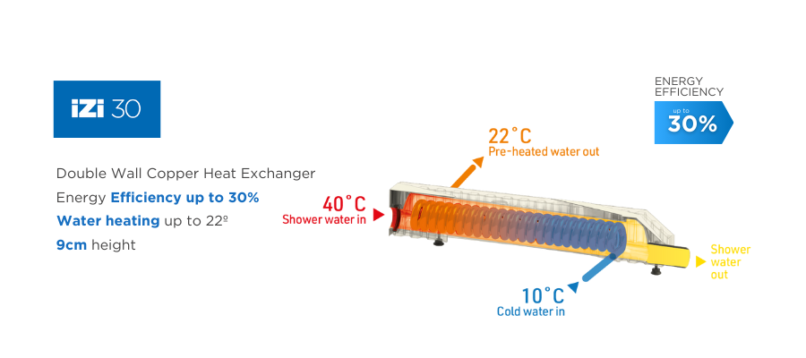 Zypho® iZi transfere o calor da água desperdiçada do duche (40º) para a entrada de água fria (10º). Essa água pré-aquecida (até 22º) é então direcionada à torneira misturadora do chuveiro, ao esquentador de água ou, de preferência a ambos - reduzindo o consumo de energia entre 25%-31% - Melhorando assim a eficiência energética. A cada três banhos, um é gratuito.